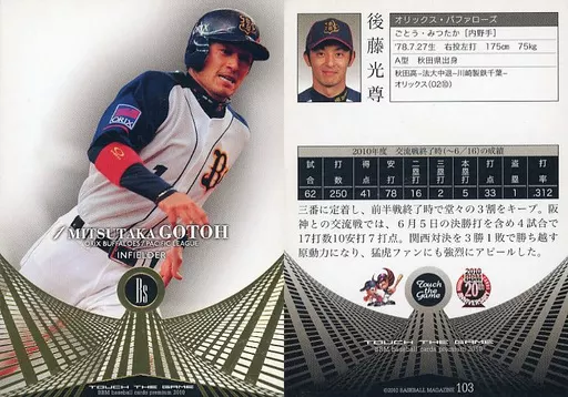 Nombre comercial en japonés: BBM/BBM2010 Touch the game(タッチ・ザ・ゲーム) 103 [レギュラーカード] : 後藤光尊