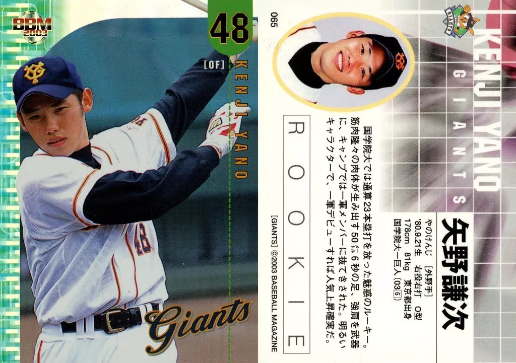 Nombre comercial en japonés: BBM/レギュラー/BBM2003 読売ジャイアンツ 065[レギュラー]:矢野謙次(パラレル版)