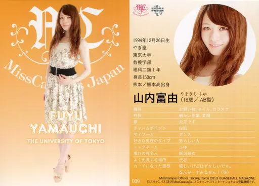 Nombre comercial en japonés: BBM/レギュラー/BBMミスキャンパス 2013 009[レギュラー]:山内富由