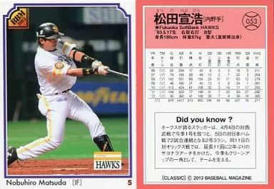 Nombre comercial en japonés: BBM/現役レギュラー/2013BBMベースボールカード CLASSIC 053 [現役レギュラー] : 松田宣浩
