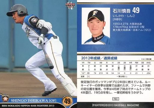 Nombre comercial en japonés: BBM/レギュラーカード/BBM2013 北海道日本ハムファイターズ F63 [レギュラーカード] : 石川慎吾