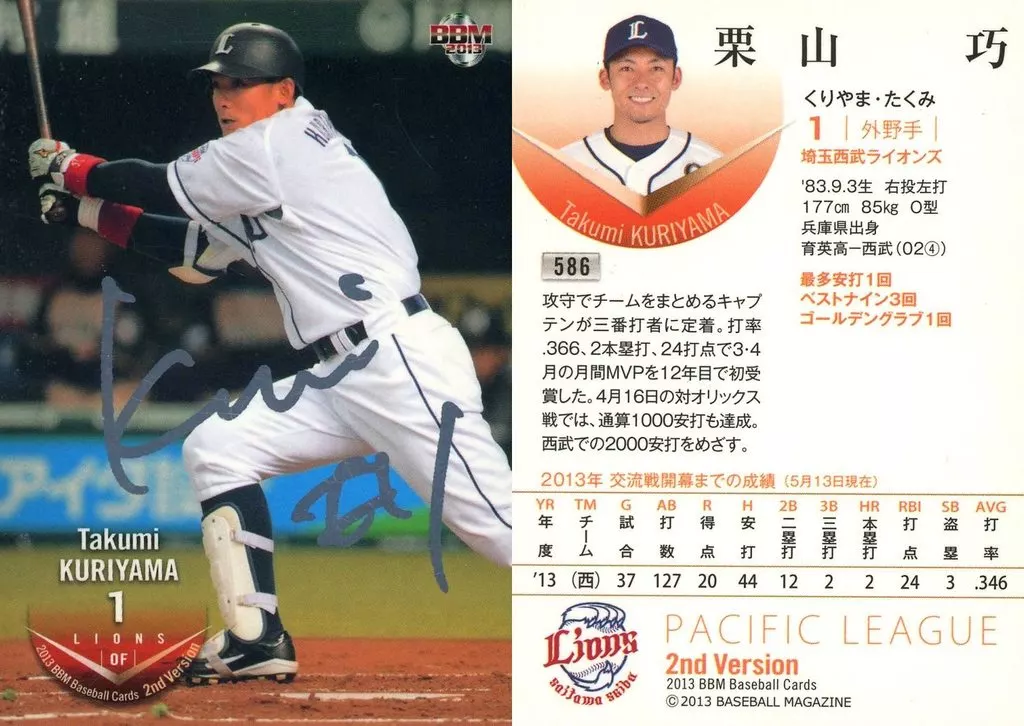 Nombre comercial en japonés: BBM/レギュラー/BBM 2013 ベースボールカード 2ndバージョン 586[レギュラー]:栗山巧(銀箔サイン入り)