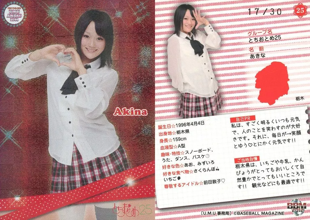 Nombre comercial en japonés: コレクションカード(女性)/U.M.U AWARD ご当地アイドルトレーディングカード~地域活性アイドル大図鑑~ 25[レギュラー]:あきな(ホロパラレル)(/30)
