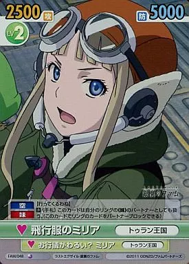 Nombre comercial en japonés: ヴィクトリースパーク/SR/ブースターパック ラストエグザイル-銀翼のファム- FAM/048[SR]:(ホロ)飛行服のミリア