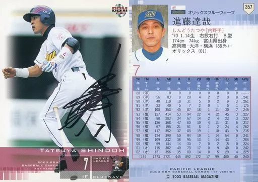 Nombre comercial en japonés: BBM/レギュラーカード/BBM2003ベースボールカード1st 357:進藤達哉「オリックスブルーウェーブ」/サインパラレル