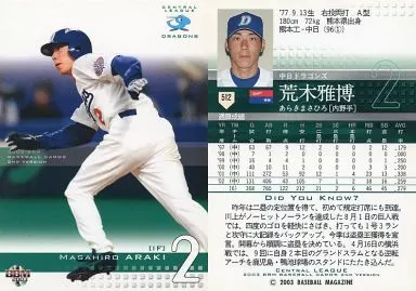 Nombre comercial en japonés: BBM/レギュラーカード/BBM2003ベースボールカード2nd 512:荒木雅博「中日ドラゴンズ」