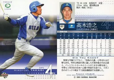 Nombre comercial en japonés: BBM/レギュラーカード/BBM2003ベースボールカード2nd 637:高木浩之「埼玉西武ライオンズ」