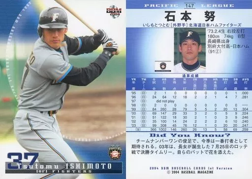 Nombre comercial en japonés: BBM/レギュラーカード/BBM2004ベースボールカード1st 147:石本努「北海道日本ハムファイターズ」