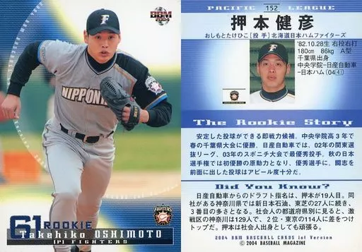 Nombre comercial en japonés: BBM/レギュラーカード/BBM2004ベースボールカード1st 152:押本健彦「北海道日本ハムファイターズ」