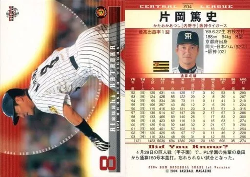 Nombre comercial en japonés: BBM/レギュラーカード/BBM2004ベースボールカード1st 204:片岡篤史「阪神タイガース」