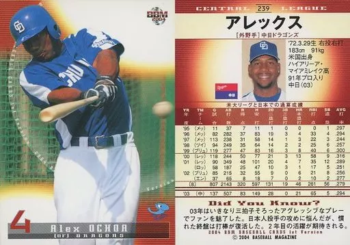 Nombre comercial en japonés: BBM/レギュラーカード/BBM2004ベースボールカード1st 239:アレックス「中日ドラゴンズ」