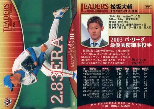 Nombre comercial en japonés: BBM/レギュラーカード/BBM2004ベースボールカード1st 391:松坂大輔「埼玉西武ライオンズ」