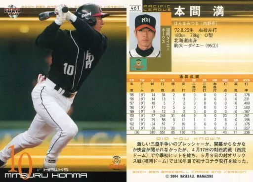 Nombre comercial en japonés: BBM/レギュラーカード/BBM2004ベースボールカード2nd 461:本間満「福岡ダイエーホークス」