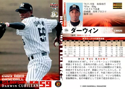 Nombre comercial en japonés: BBM/レギュラーカード/BBM2005ベースボールカード1st 384 : ダーウィン「阪神タイガース」