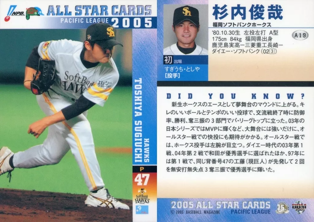 Nombre comercial en japonés: BBM/オールスターカード/BBM2005ベースボールカード A19:杉内俊哉「福岡ソフトバンクホークス」