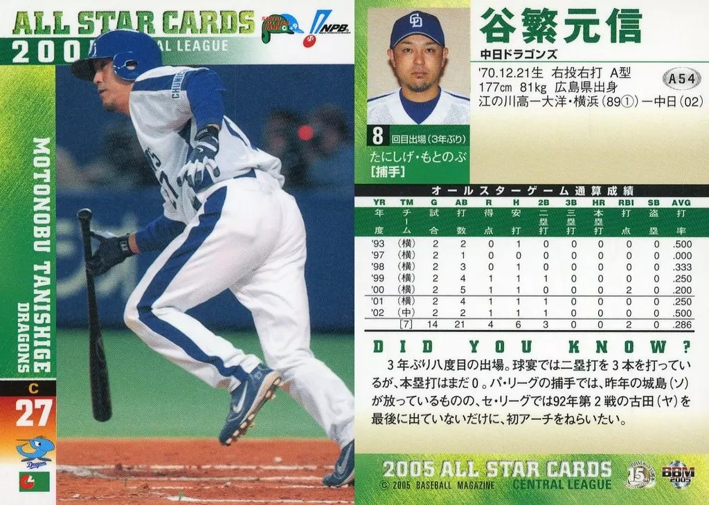 Nombre comercial en japonés: BBM/オールスターカード/BBM2005ベースボールカード A54:谷繁元信「中日ドラゴンズ」