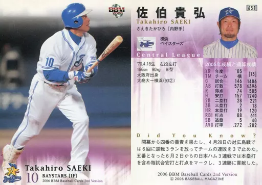 Nombre comercial en japonés: BBM/レギュラーカード/BBM2006ベースボールカード2nd 651:佐伯貴弘「横浜ベイスターズ」