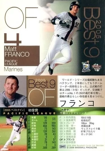 Nombre comercial en japonés: BBM/ベストナインカード/BBM2006ベースボールカード BN9 : フランコ「千葉ロッテマリーンズ」/(ノーマル版)