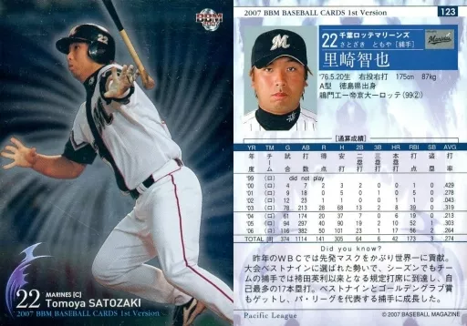Nombre comercial en japonés: BBM/レギュラーカード/BBM2007ベースボールカード1st 123 : 里崎智也「千葉ロッテマリーンズ」