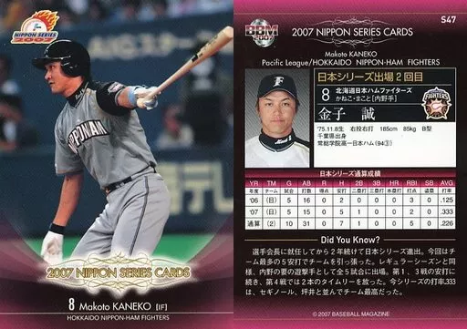Nombre comercial en japonés: BBM/日本シリーズカード/BBM2007ベースボールカード S47:金子誠「北海道日本ハムファイターズ」