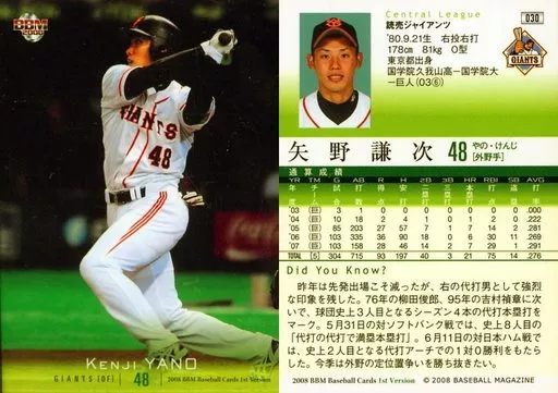 Nombre comercial en japonés: BBM/レギュラーカード/読売ジャイアンツ/BBM2008 ベースボールカード 1stバージョン 030 [レギュラーカード] : 矢野謙次