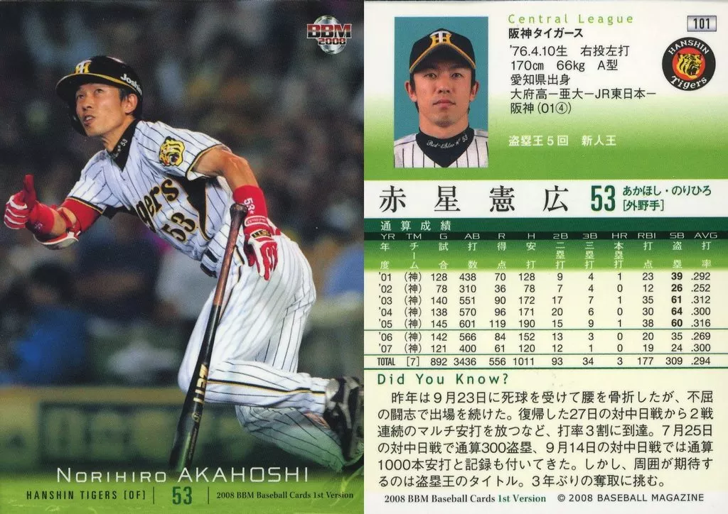 Nombre comercial en japonés: BBM/レギュラーカード/阪神タイガース/BBM2008 ベースボールカード 1stバージョン 101[レギュラーカード]:赤星憲広