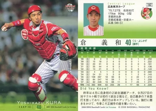 Nombre comercial en japonés: BBM/レギュラーカード/広島東洋カープ/BBM2008 ベースボールカード 1stバージョン 162 [レギュラーカード] : 倉義和