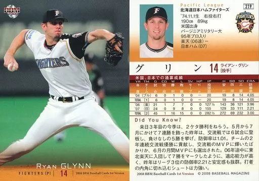 Nombre comercial en japonés: BBM/レギュラーカード/北海道日本ハムファイターズ/BBM2008 ベースボールカード 1stバージョン 219 [レギュラーカード] : グリン