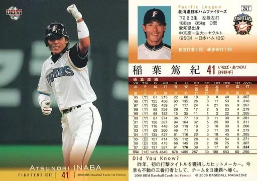 Nombre comercial en japonés: BBM/レギュラーカード/北海道日本ハムファイターズ/BBM2008 ベースボールカード 1stバージョン 241 [レギュラーカード] : 稲葉篤紀