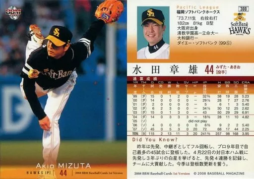 Nombre comercial en japonés: BBM/レギュラーカード/福岡ソフトバンクホークス/BBM2008 ベースボールカード 1stバージョン 300 [レギュラーカード] : 水田章雄