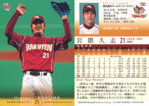 Nombre comercial en japonés: BBM/レギュラーカード/東北楽天ゴールデンイーグルス/BBM2008 ベースボールカード 1stバージョン 330 [レギュラーカード] : 岩隈久志