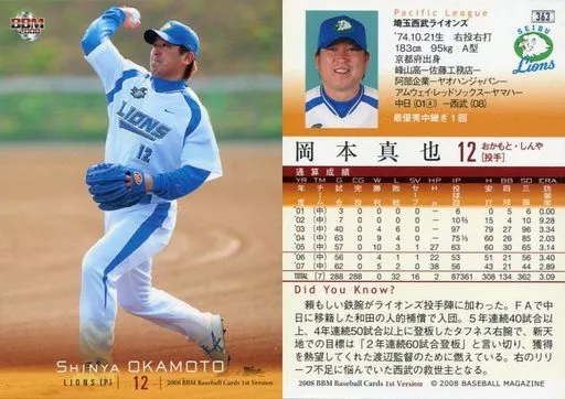 Nombre comercial en japonés: BBM/レギュラーカード/埼玉西武ライオンズ/BBM2008 ベースボールカード 1stバージョン 363 [レギュラーカード] : 岡本真也
