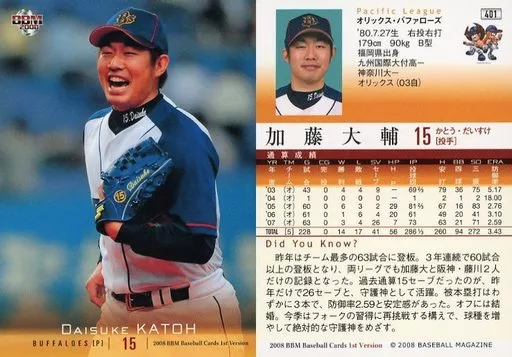Nombre comercial en japonés: BBM/レギュラーカード/オリックス・バファローズ/BBM2008 ベースボールカード 1stバージョン 401 [レギュラーカード] : 加藤大輔