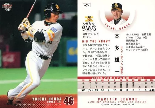 Nombre comercial en japonés: BBM/レギュラーカード/福岡ソフトバンクホークス/BBM2008 ベースボールカード2ndバージョン 665 [レギュラーカード] : 本多雄一