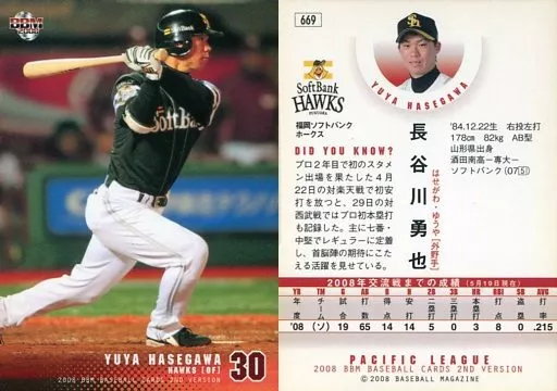 Nombre comercial en japonés: BBM/レギュラーカード/福岡ソフトバンクホークス/BBM2008 ベースボールカード2ndバージョン 669 [レギュラーカード] : 長谷川勇也