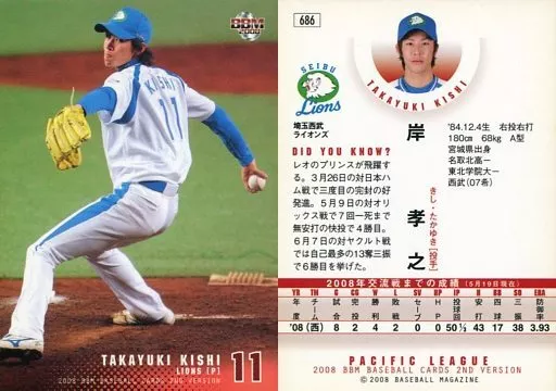 Nombre comercial en japonés: BBM/レギュラーカード/埼玉西武ライオンズ/BBM2008 ベースボールカード2ndバージョン 686 [レギュラーカード] : 岸孝之