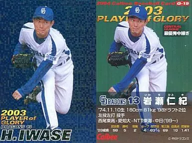 Nombre comercial en japonés: スポーツ/2004プロ野球チップス第1弾/中日/プレイヤー オブ グローリーカード G-19:岩瀬 仁紀(青版)
