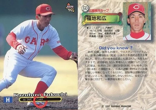 Nombre comercial en japonés: BBM/レギュラーカード/広島東洋カープ/BBM’97 ベースボールカード 345 [レギュラーカード] : 福地和広