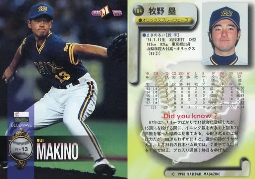 Nombre comercial en japonés: BBM/レギュラーカード/オリックス・ブルーウェーブ/BBM’98 ベースボールカード 184 [レギュラーカード] : 牧野塁