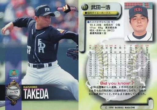 Nombre comercial en japonés: BBM/レギュラーカード/福岡ダイエーホークス/BBM’98 ベースボールカード 237 [レギュラーカード] : 武田一浩