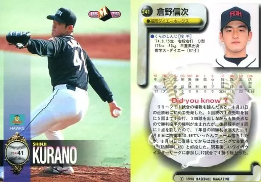 Nombre comercial en japonés: BBM/レギュラーカード/福岡ダイエーホークス/BBM’98 ベースボールカード 241 [レギュラーカード] : 倉野信次