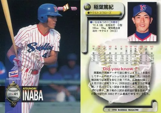 Nombre comercial en japonés: BBM/レギュラーカード/ヤクルトスワローズ/BBM’98 ベースボールカード 287 [レギュラーカード] : 稲葉篤紀