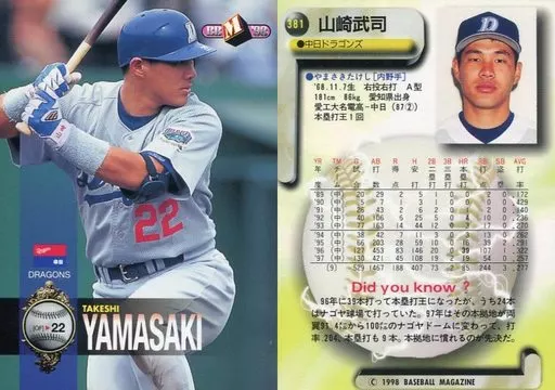 Nombre comercial en japonés: BBM/レギュラーカード/中日ドラゴンズ/BBM’98 ベースボールカード 381 [レギュラーカード] : 山崎武司