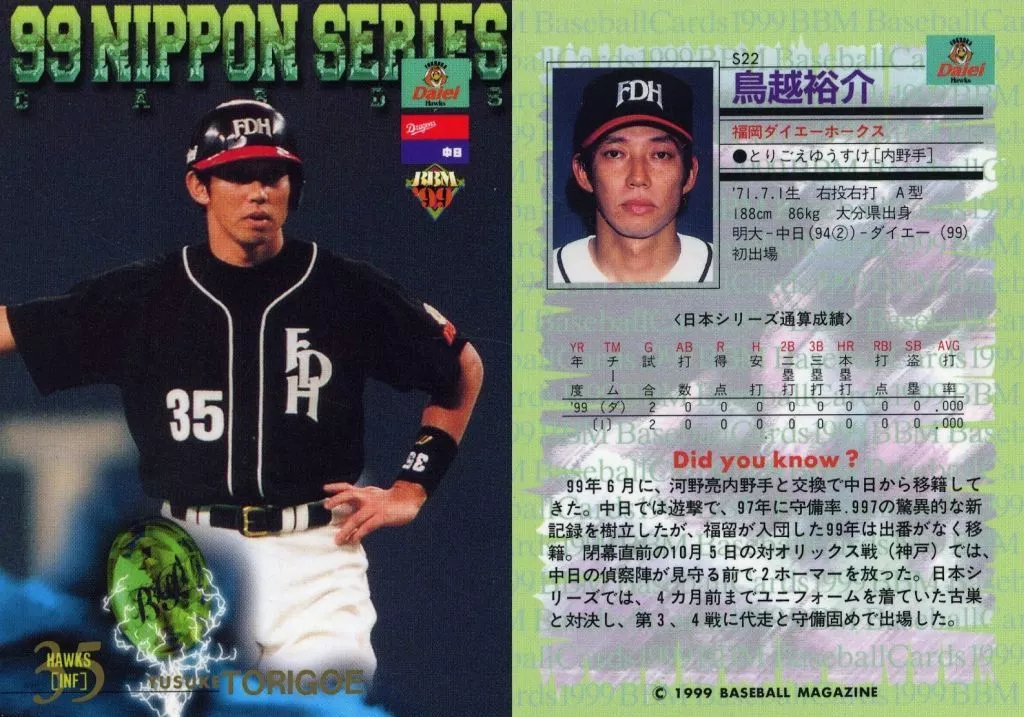 Nombre comercial en japonés: BBM/日本シリーズカード/BBM99ベースボールカード S22:鳥越裕介「福岡ダイエーホークス」