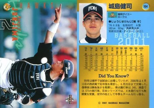 Nombre comercial en japonés: BBM/レギュラーカード/BBM2001ベースボールカード 164:城島健司「福岡ダイエーホークス」