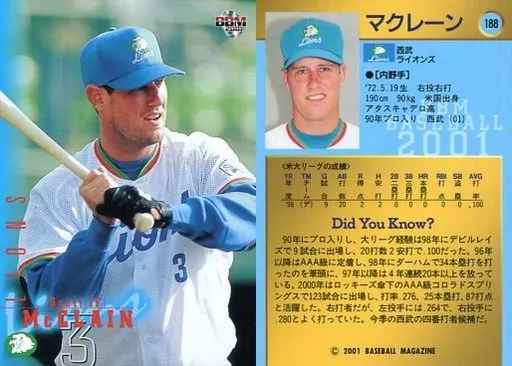 Nombre comercial en japonés: BBM/レギュラーカード/BBM2001ベースボールカード 188:マクレーン「埼玉西武ライオンズ」