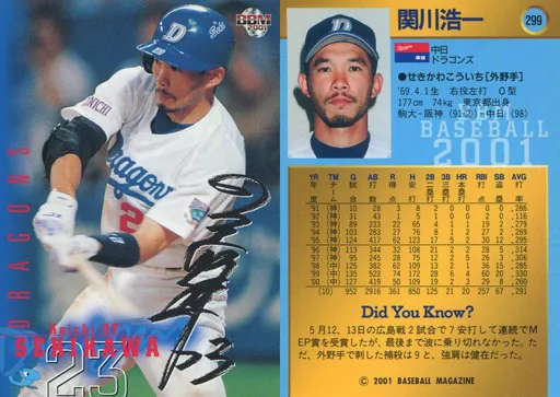 Nombre comercial en japonés: BBM/レギュラーカード/BBM2001ベースボールカード 299:関川浩一(黒サインパラレル版)