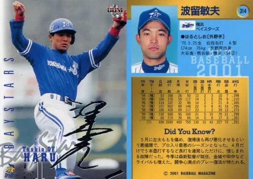 Nombre comercial en japonés: BBM/レギュラーカード/BBM2001ベースボールカード 314:波留敏夫(黒サインパラレル版)