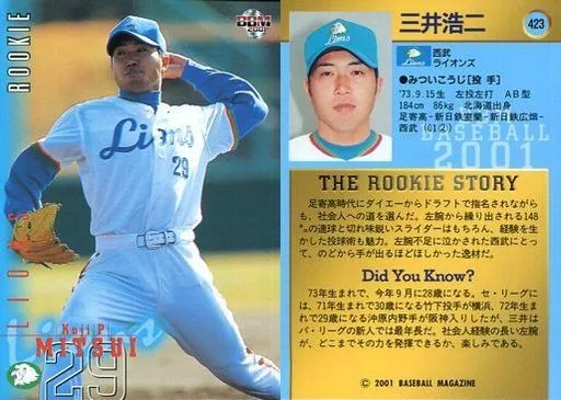 Nombre comercial en japonés: BBM/レギュラーカード/BBM2001ベースボールカード 423:三井浩二「埼玉西武ライオンズ」
