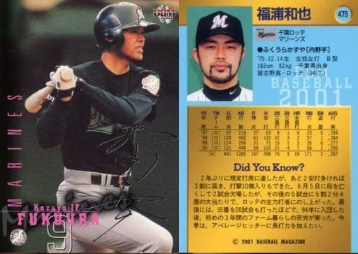 Nombre comercial en japonés: BBM/レギュラーカード/BBM2001ベースボールカード 475:福浦和也(黒サインパラレル版)